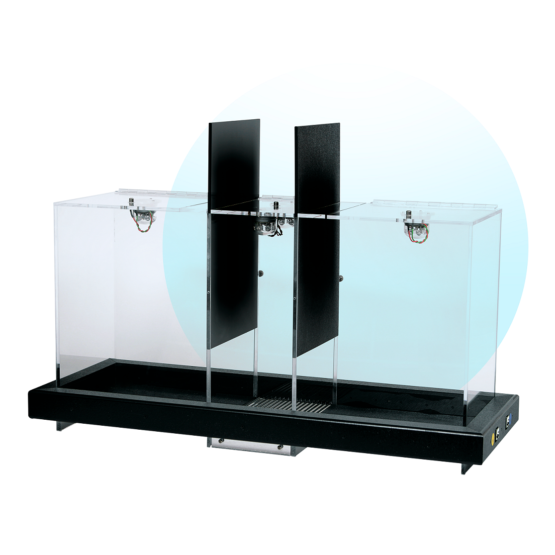 The test enclosure is designed with clear acrylic walls providing the ability to attach any type of cue.  Removable floors allow the user to create custom floors from virtually any material to meet specific study requirements.  High-intensity LED ceiling lights are long-lasting and emit no heat.  Manually operated doors rise fully, providing an unobstructed pathway for the subject to cross between chambers.
