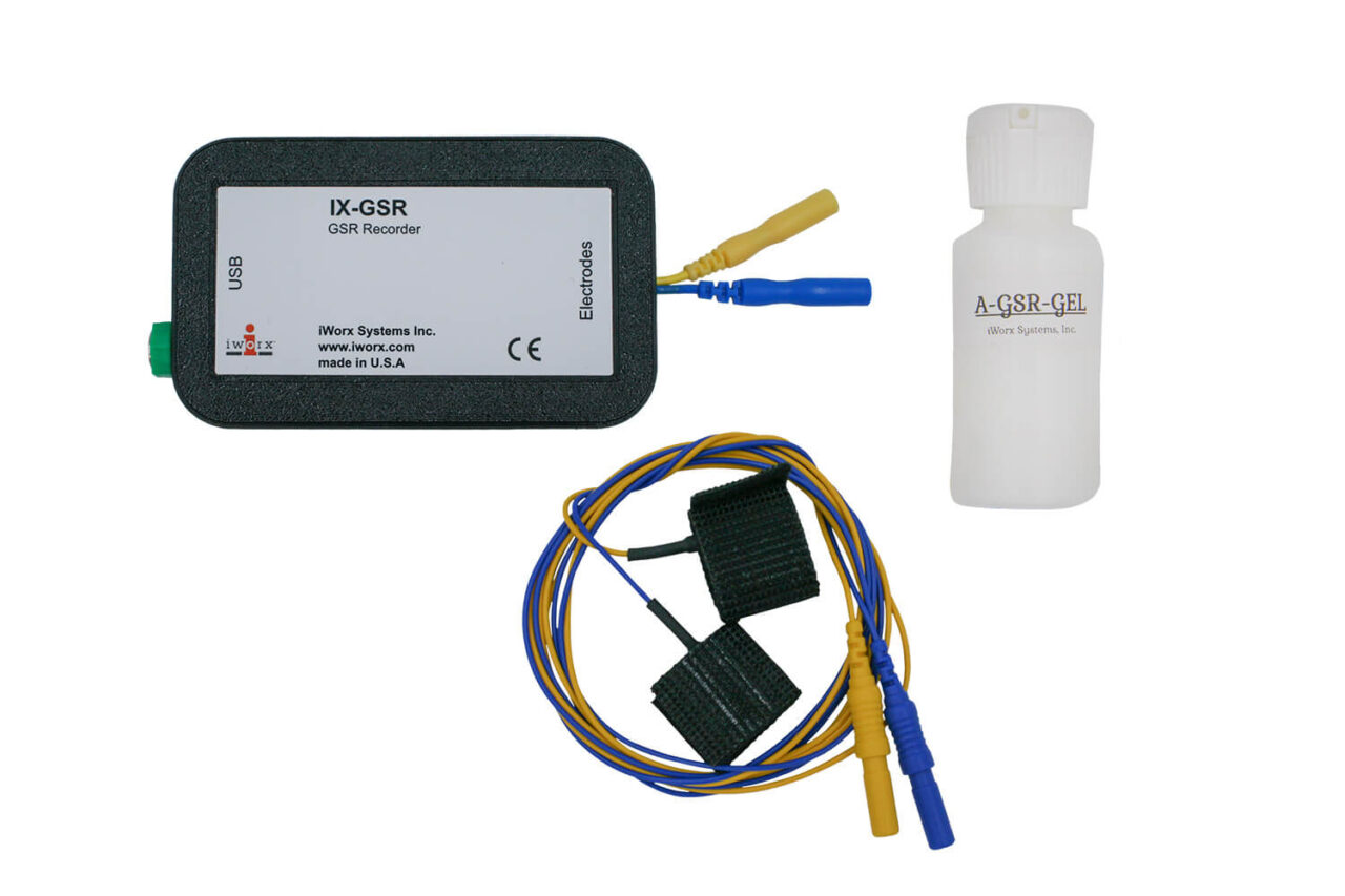 The IX-GSR recording module allows recording of? GSR (galvanic skin response) or EDA ( Electrodermal activity). The recorder includes iWorx LabScribe Recording and Analysis Software and connects directly to a USB port on either a Macintosh or Windows computer. The module connects to the subject by finger electrodes to record GSR.