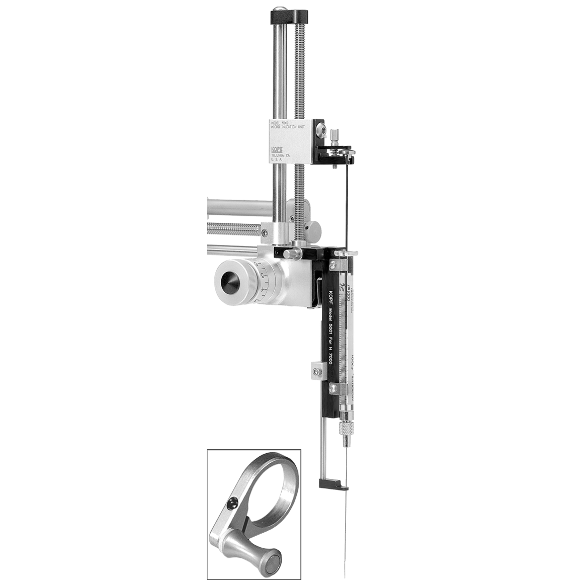 Model 5001 Syringe Holder for Hamilton series syringes with .305″/.308″ barrel diameter, 25 gauge needle. Model 1770-C Upper Bracket Assembly for attachment to Kopf manipulator.