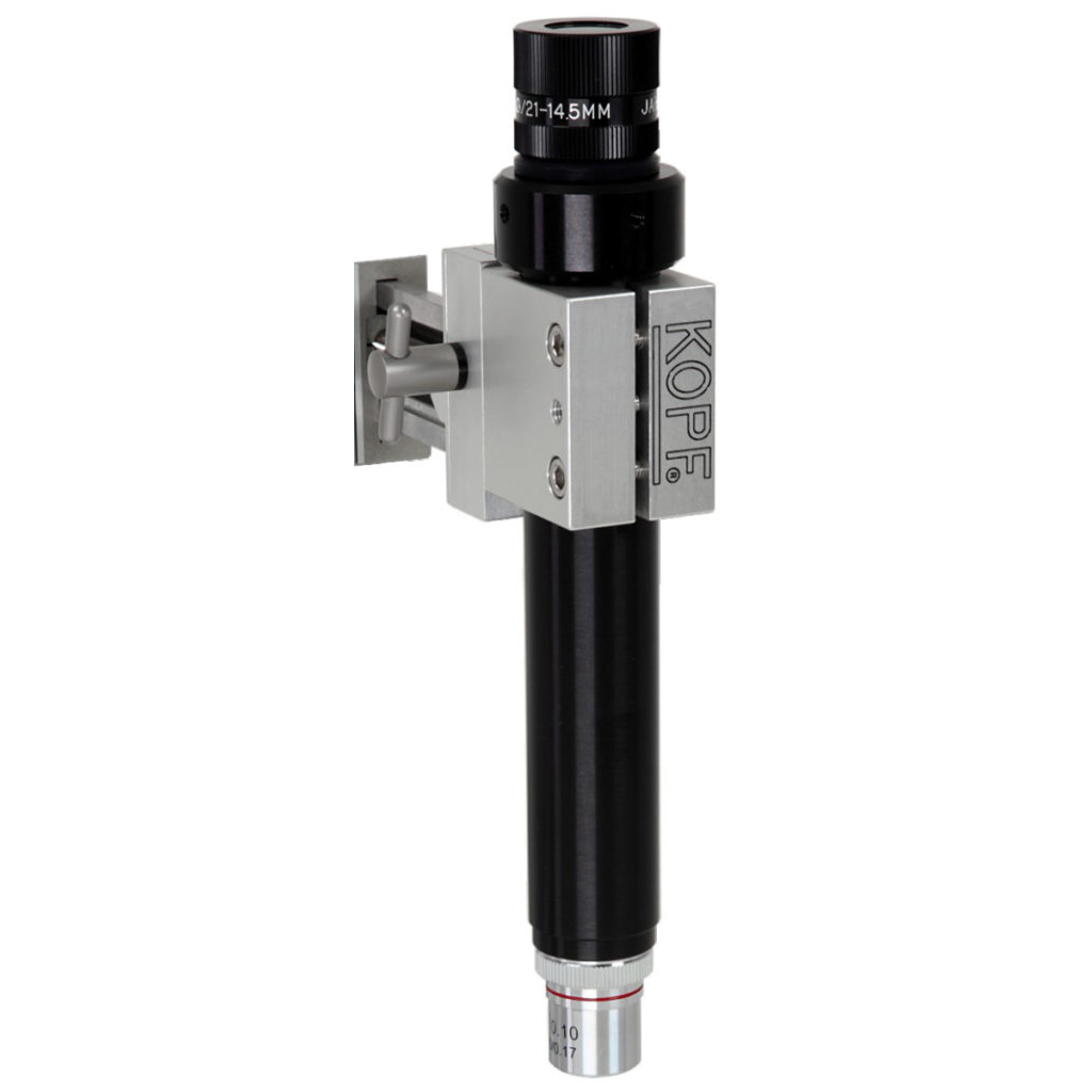 Model 1915 Centering Scope 40X magnification is used to assist with positioning the stereotaxic manipulator accurately over the centering height gauge located on the stereotaxic base. The manipulator position is moved until the cross hair of the scope is lined up and in focus with the centering height gauge, which represents the center of all axes of rotation of the stereotaxic head holder (zero point of reference).