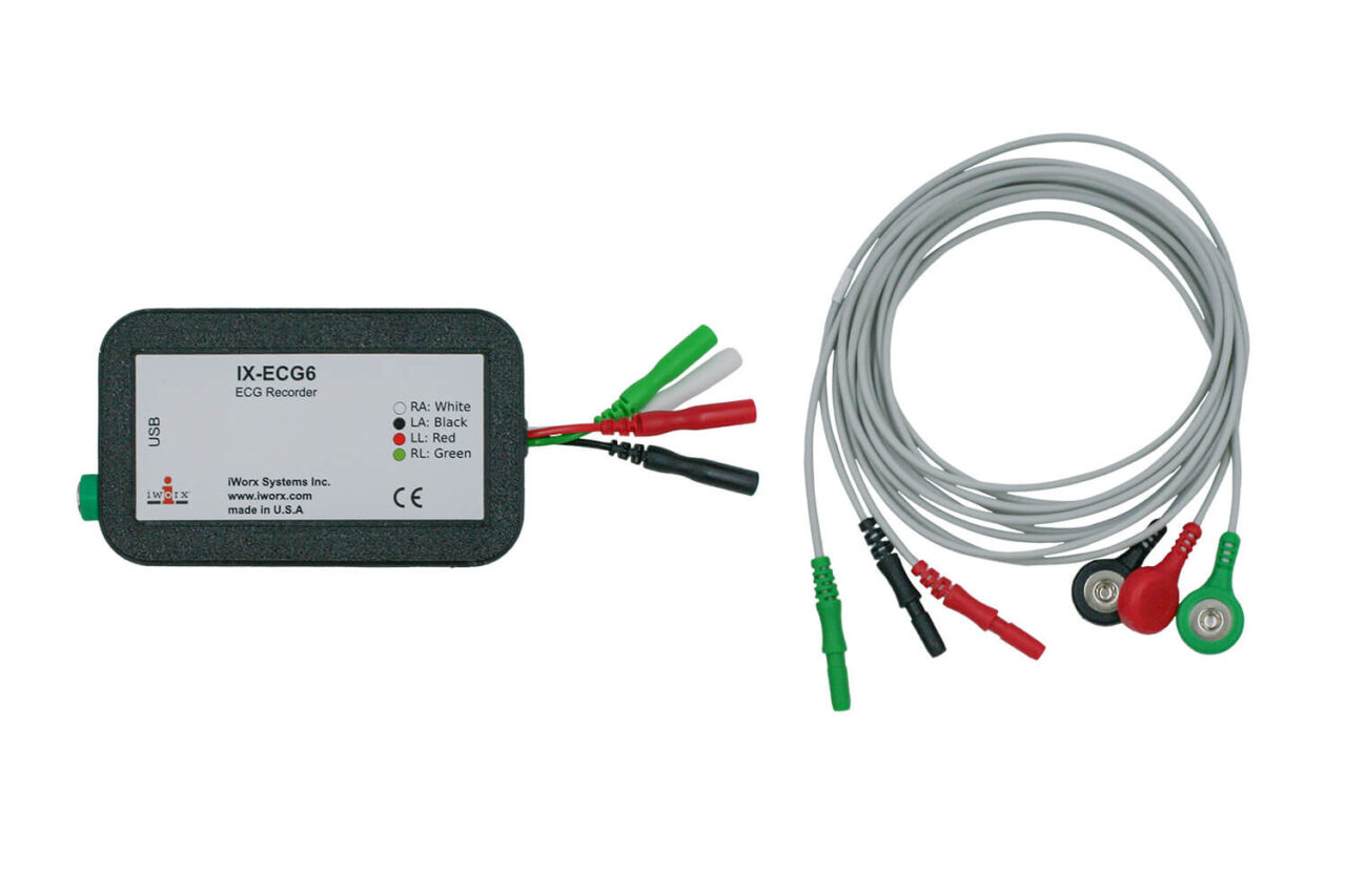 The IX-ECG6 connects to and is powered by a USB port on any Windows or Macintosh computer. Data is recorded and analyzed with iWorx advanced LabScribe ECG Software Module.